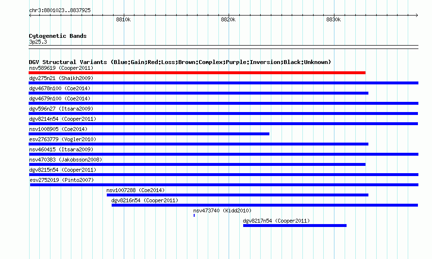 Variant DetailsVariant: nssv655174| Internal ID | 15045140 | | Landmark | | | Location Information | | | Cytoband | 3p25.3 | | Allele length | | Assembly | Allele length | | hg38 | 36903 | | hg19 | 36903 | | hg18 | 36903 | | hg17 | 36903 |