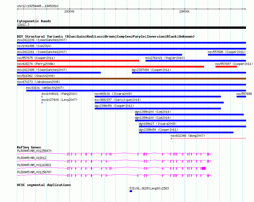 | Variant Type | CNV gain | Copy Number | | Allele State | | Allele Origin | | Probe Count | | Validation Flag | | Merged Status | S | Merged Variants | nsv516362 | Supporting Variants | | Samples | | Known Genes | PLEKHA5 | Method | SNP array | Analysis | Sample-level CNVs | Platform | GPL6434 | Comments | | Reference | Shaikh_et_al_2009 | Pubmed ID | 19592680 | Accession Number(s) | nssv656916