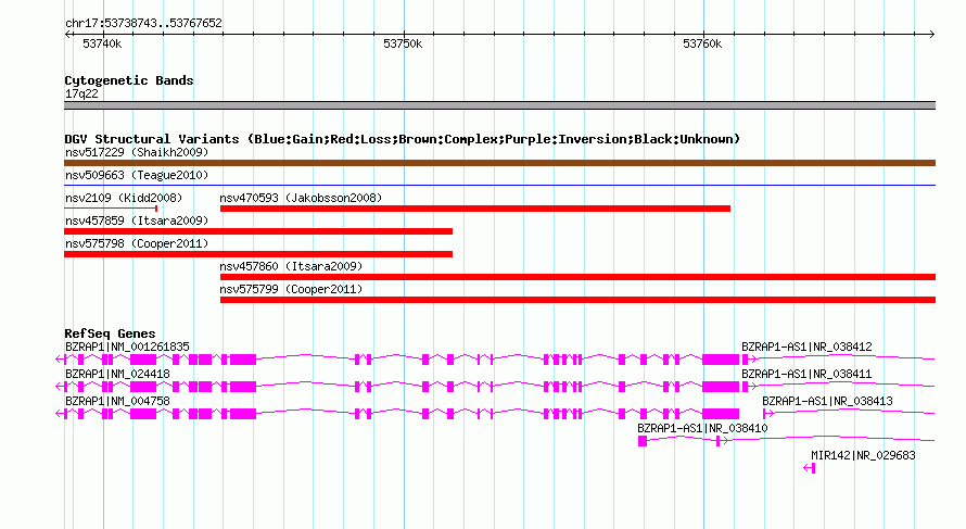 | | Variant Type | CNV loss | | Copy Number | | | Allele State | Heterozygous | | Allele Origin | | | Probe Count | | | Validation Flag | | | Merged Status | S | | Merged Variants | nsv517229 | | Supporting Variants | | | Samples | | | Known Genes | BZRAP1, BZRAP1-AS1, MIR142 | | Method | SNP array | | Analysis | Sample-level CNVs | | Platform | GPL6434 | | Comments | | | Reference | Shaikh_et_al_2009 | | Pubmed ID | 19592680 | | Accession Number(s) | nssv656919