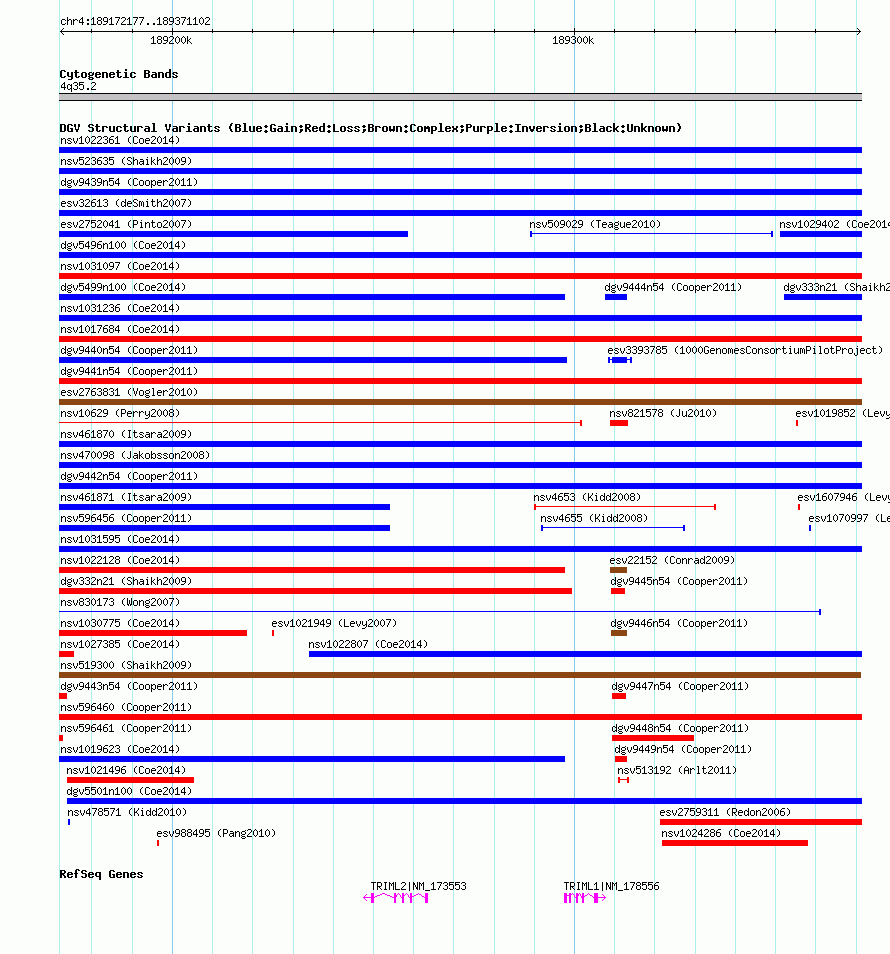 | Variant Type | CNV gain | Copy Number | | Allele State | | Allele Origin | | Probe Count | | Validation Flag | | Merged Status | S | Merged Variants | nsv519300 | Supporting Variants | | Samples | | Known Genes | TRIML1, TRIML2 | Method | SNP array | Analysis | Sample-level CNVs | Platform | GPL6434 | Comments | | Reference | Shaikh_et_al_2009 | Pubmed ID | 19592680 | Accession Number(s) | nssv656925