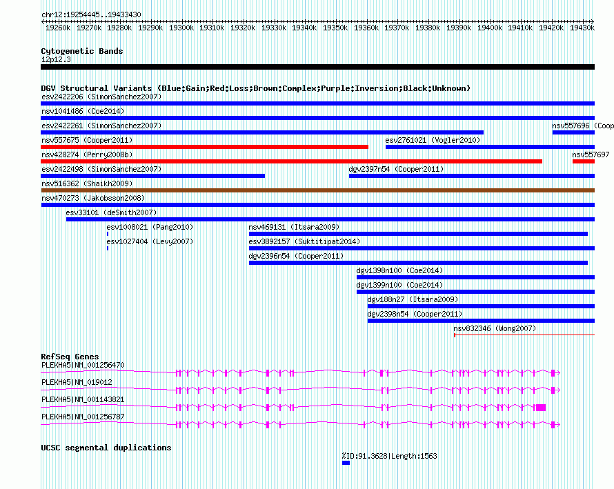 | Variant Type | CNV gain | Copy Number | | Allele State | | Allele Origin | | Probe Count | | Validation Flag | | Merged Status | S | Merged Variants | nsv516362 | Supporting Variants | | Samples | | Known Genes | PLEKHA5 | Method | SNP array | Analysis | Sample-level CNVs | Platform | GPL6434 | Comments | | Reference | Shaikh_et_al_2009 | Pubmed ID | 19592680 | Accession Number(s) | nssv657038