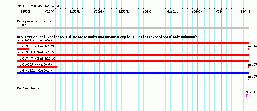 Variant DetailsVariant: nssv657270| Internal ID | 15393922 | | Landmark | | | Location Information | | | Cytoband | 11q12.3 | | Allele length | | Assembly | Allele length | | hg38 | 9450 | | hg19 | 9450 | | hg18 | 9450 | | hg17 | 9450 |