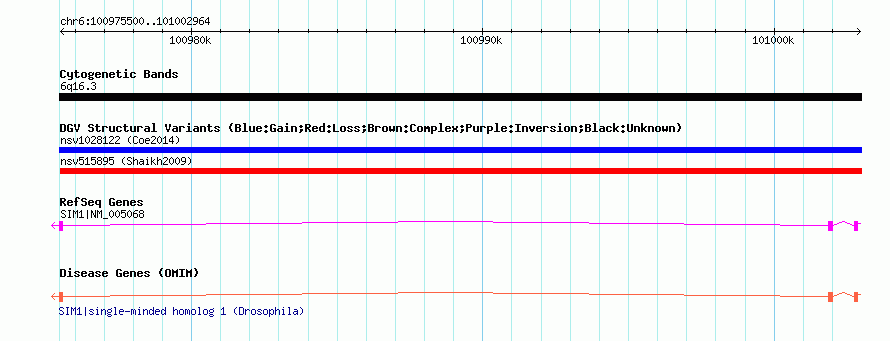| | Variant Type | CNV loss | | Copy Number | | | Allele State | Heterozygous | | Allele Origin | | | Probe Count | | | Validation Flag | | | Merged Status | S | | Merged Variants | nsv515895 | | Supporting Variants | | | Samples | | | Known Genes | SIM1 | | Method | SNP array | | Analysis | Sample-level CNVs | | Platform | GPL6434 | | Comments | | | Reference | Shaikh_et_al_2009 | | Pubmed ID | 19592680 | | Accession Number(s) | nssv657822