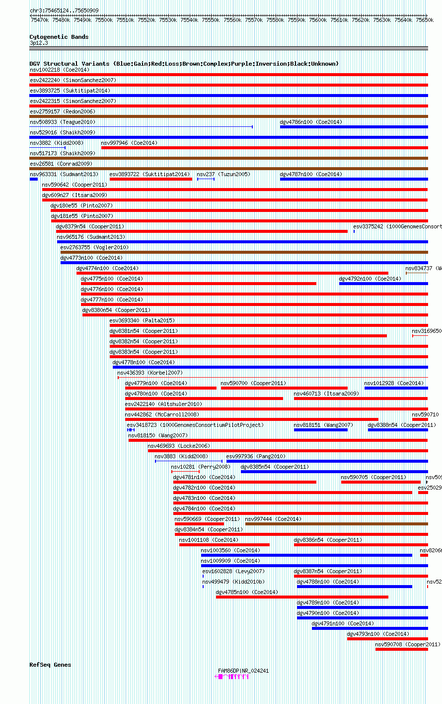 Variant DetailsVariant: nssv659278| Internal ID | 15395930 | | Landmark | | | Location Information | | | Cytoband | 3p12.3 | | Allele length | | Assembly | Allele length | | hg38 | 185786 | | hg19 | 185786 | | hg18 | 185786 | | hg17 | 185786 |