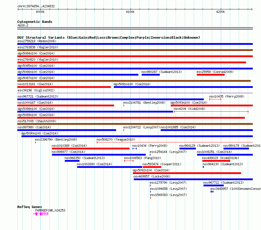 Variant DetailsVariant: nssv659839| Internal ID | 15396491 | | Landmark | | | Location Information | | | Cytoband | 4p16.2 | | Allele length | | Assembly | Allele length | | hg38 | 260204 | | hg19 | 260204 | | hg18 | 260179 | | hg17 | 260179 |