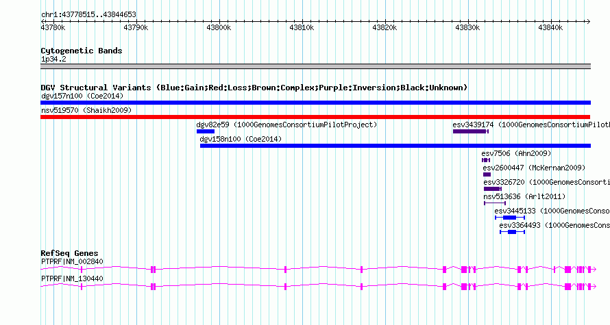 Variant DetailsVariant: nssv660985| Internal ID | 15397637 | | Landmark | | | Location Information | | | Cytoband | 1p34.2 | | Allele length | | Assembly | Allele length | | hg38 | 66139 | | hg19 | 66139 | | hg18 | 66139 | | hg17 | 66139 |