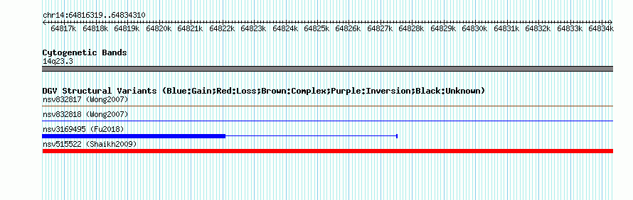 Variant DetailsVariant: nssv661252| Internal ID | 15397904 | | Landmark | | | Location Information | | | Cytoband | 14q23.3 | | Allele length | | Assembly | Allele length | | hg38 | 17992 | | hg19 | 17992 | | hg18 | 17992 | | hg17 | 17992 |