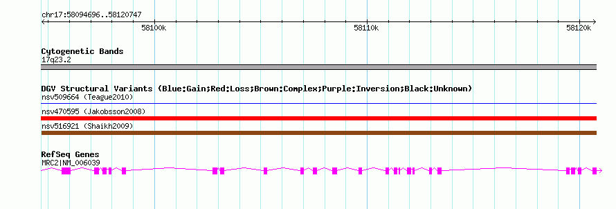 | | Variant Type | CNV loss | | Copy Number | | | Allele State | Heterozygous | | Allele Origin | | | Probe Count | | | Validation Flag | | | Merged Status | S | | Merged Variants | nsv516921 | | Supporting Variants | | | Samples | | | Known Genes | MRC2 | | Method | SNP array | | Analysis | Sample-level CNVs | | Platform | GPL6434 | | Comments | | | Reference | Shaikh_et_al_2009 | | Pubmed ID | 19592680 | | Accession Number(s) | nssv663321