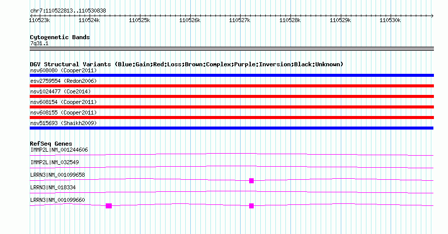 Variant DetailsVariant: nssv665621| Internal ID | 15402273 | | Landmark | | | Location Information | | | Cytoband | 7q31.1 | | Allele length | | Assembly | Allele length | | hg38 | 8026 | | hg19 | 8026 | | hg18 | 8026 | | hg17 | 8026 |