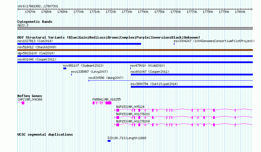 | Variant Type | CNV gain | Copy Number | | Allele State | | Allele Origin | | Probe Count | | Validation Flag | | Merged Status | S | Merged Variants | nsv516012 | Supporting Variants | | Samples | | Known Genes | CAP2, FAM8A1, NUP153 | Method | SNP array | Analysis | Sample-level CNVs | Platform | GPL6434 | Comments | | Reference | Shaikh_et_al_2009 | Pubmed ID | 19592680 | Accession Number(s) | nssv665717