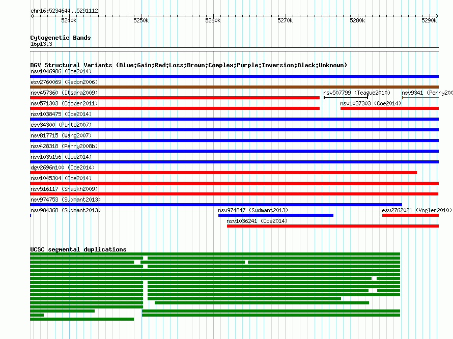 Variant DetailsVariant: nssv666316| Internal ID | 15056282 | | Landmark | | | Location Information | | | Cytoband | 16p13.3 | | Allele length | | Assembly | Allele length | | hg38 | 56469 | | hg19 | 56469 | | hg18 | 56469 | | hg17 | 56469 |
