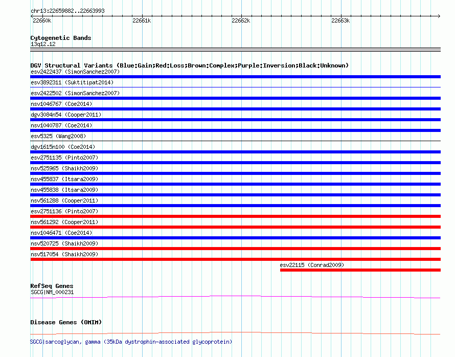 | | Variant Type | CNV loss | | Copy Number | | | Allele State | Heterozygous | | Allele Origin | | | Probe Count | | | Validation Flag | | | Merged Status | S | | Merged Variants | nsv517054 | | Supporting Variants | | | Samples | | | Known Genes | SGCG | | Method | SNP array | | Analysis | Sample-level CNVs | | Platform | GPL6434 | | Comments | | | Reference | Shaikh_et_al_2009 | | Pubmed ID | 19592680 | | Accession Number(s) | nssv666817