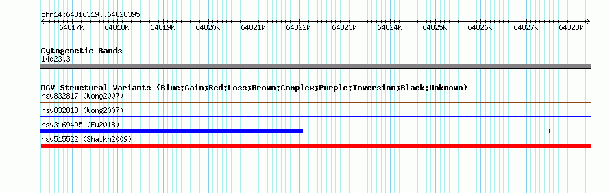 Variant DetailsVariant: nssv668449| Internal ID | 15405101 | | Landmark | | | Location Information | | | Cytoband | 14q23.3 | | Allele length | | Assembly | Allele length | | hg38 | 12077 | | hg19 | 12077 | | hg18 | 12077 | | hg17 | 12077 |