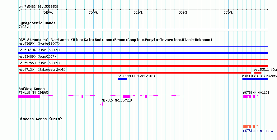 | | Variant Type | CNV loss | | Copy Number | | | Allele State | Heterozygous | | Allele Origin | | | Probe Count | | | Validation Flag | | | Merged Status | S | | Merged Variants | nsv517558 | | Supporting Variants | | | Samples | | | Known Genes | ACTB, FBXL18, MIR589 | | Method | SNP array | | Analysis | Sample-level CNVs | | Platform | GPL6434 | | Comments | | | Reference | Shaikh_et_al_2009 | | Pubmed ID | 19592680 | | Accession Number(s) | nssv668497