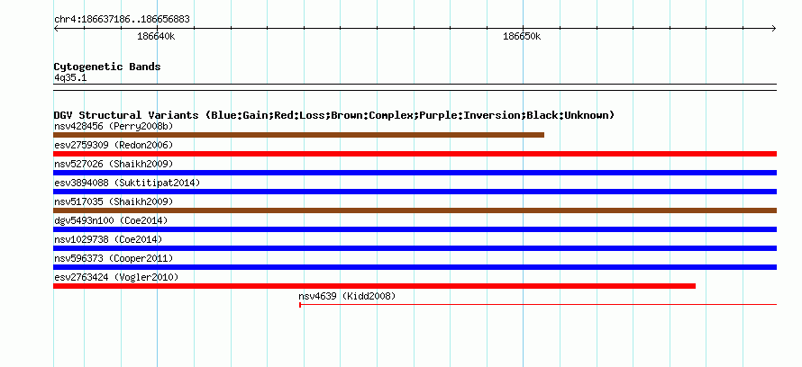 Variant DetailsVariant: nssv668995Internal ID | 15058961 | Landmark | | Location Information | | Cytoband | 4q35.1 | Allele length | Assembly | Allele length | hg38 | 19698 | hg19 | 19698 | hg18 | 19698 | hg17 | 19698 |