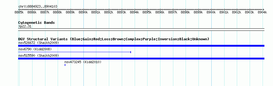 Variant DetailsVariant: nssv669030| Internal ID | 15405682 | | Landmark | | | Location Information | | | Cytoband | Xp22.31 | | Allele length | | Assembly | Allele length | | hg38 | 19181 | | hg19 | 19181 | | hg18 | 19181 | | hg17 | 19181 |