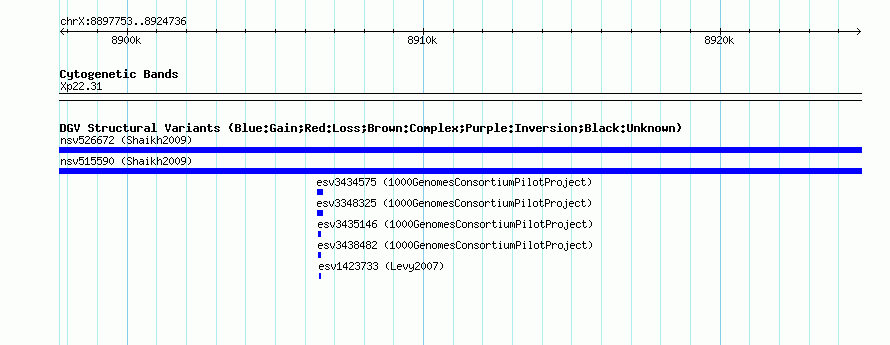 Variant DetailsVariant: nssv669465| Internal ID | 15406117 | | Landmark | | | Location Information | | | Cytoband | Xp22.31 | | Allele length | | Assembly | Allele length | | hg38 | 26984 | | hg19 | 26984 | | hg18 | 26984 | | hg17 | 26984 |