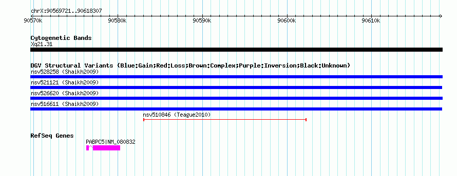 | Variant Type | CNV gain | Copy Number | | Allele State | | Allele Origin | | Probe Count | | Validation Flag | | Merged Status | S | Merged Variants | nsv516611 | Supporting Variants | | Samples | | Known Genes | PABPC5 | Method | SNP array | Analysis | Sample-level CNVs | Platform | GPL6434 | Comments | | Reference | Shaikh_et_al_2009 | Pubmed ID | 19592680 | Accession Number(s) | nssv669524