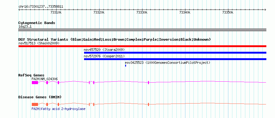 | | Variant Type | CNV loss | | Copy Number | | | Allele State | Heterozygous | | Allele Origin | | | Probe Count | | | Validation Flag | | | Merged Status | S | | Merged Variants | nsv517513 | | Supporting Variants | | | Samples | | | Known Genes | FA2H | | Method | SNP array | | Analysis | Sample-level CNVs | | Platform | GPL6434 | | Comments | | | Reference | Shaikh_et_al_2009 | | Pubmed ID | 19592680 | | Accession Number(s) | nssv669555