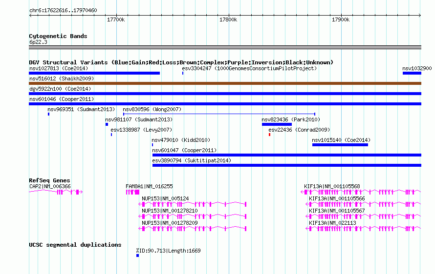 | Variant Type | CNV gain | Copy Number | | Allele State | | Allele Origin | | Probe Count | | Validation Flag | | Merged Status | S | Merged Variants | nsv516012 | Supporting Variants | | Samples | | Known Genes | CAP2, FAM8A1, KIF13A, NUP153 | Method | SNP array | Analysis | Sample-level CNVs | Platform | GPL6434 | Comments | | Reference | Shaikh_et_al_2009 | Pubmed ID | 19592680 | Accession Number(s) | nssv670663