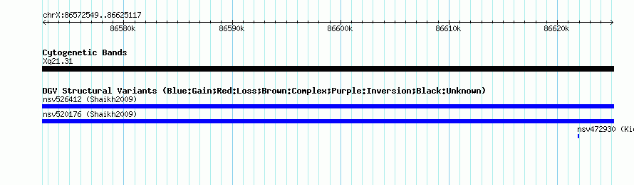 Variant DetailsVariant: nssv671251| Internal ID | 15407903 | | Landmark | | | Location Information | | | Cytoband | Xq21.31 | | Allele length | | Assembly | Allele length | | hg38 | 52569 | | hg19 | 52569 | | hg18 | 52569 | | hg17 | 52569 |