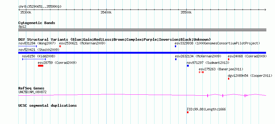 | Variant Type | CNV gain | Copy Number | | Allele State | | Allele Origin | | Probe Count | | Validation Flag | | Merged Status | S | Merged Variants | nsv520421 | Supporting Variants | | Samples | | Known Genes | UNC5D | Method | SNP array | Analysis | Sample-level CNVs | Platform | GPL6434 | Comments | | Reference | Shaikh_et_al_2009 | Pubmed ID | 19592680 | Accession Number(s) | nssv671338