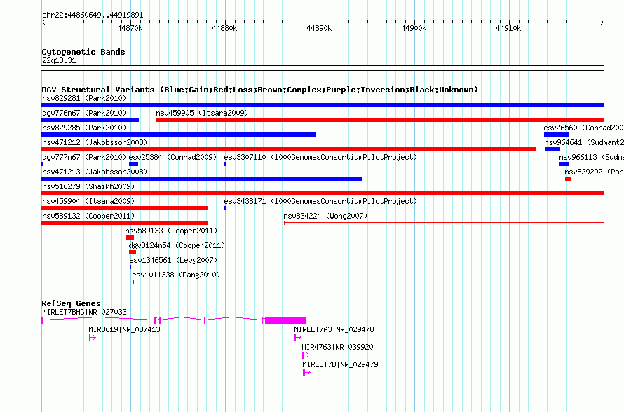 Variant DetailsVariant: nssv672532| Internal ID | 15409184 | | Landmark | | | Location Information | | | Cytoband | 22q13.31 | | Allele length | | Assembly | Allele length | | hg38 | 59247 | | hg19 | 59243 | | hg18 | 59243 | | hg17 | 59243 |