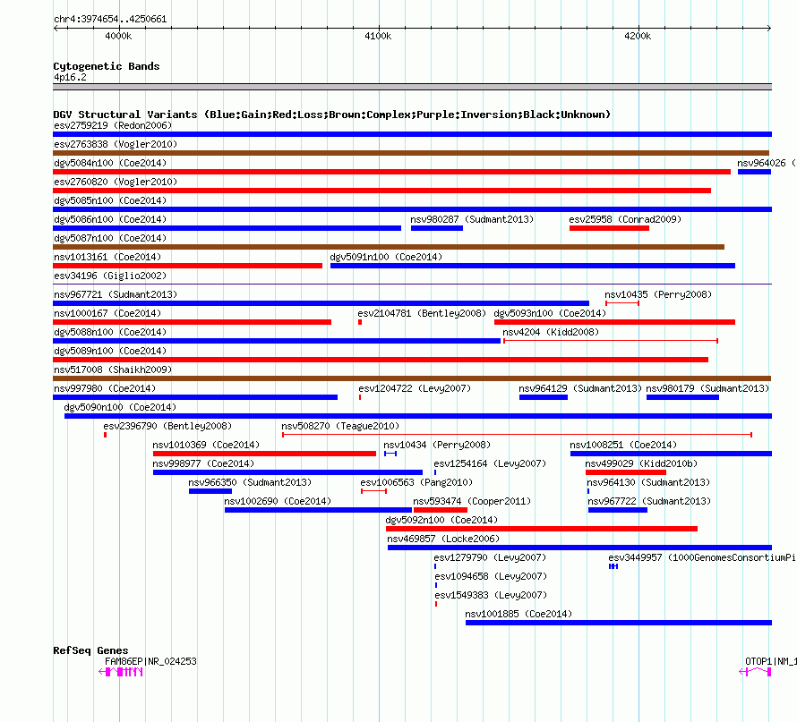 Variant DetailsVariant: nssv673095| Internal ID | 15409747 | | Landmark | | | Location Information | | | Cytoband | 4p16.2 | | Allele length | | Assembly | Allele length | | hg38 | 276033 | | hg19 | 276033 | | hg18 | 276008 | | hg17 | 276008 |