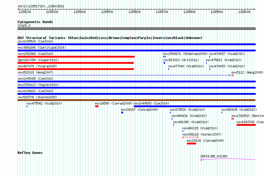 | | Variant Type | CNV gain | | Copy Number | | | Allele State | | | Allele Origin | | | Probe Count | | | Validation Flag | | | Merged Status | S | | Merged Variants | nsv515706 | | Supporting Variants | | | Samples | | | Known Genes | DOCK1 | | Method | SNP array | | Analysis | Sample-level CNVs | | Platform | GPL6434 | | Comments | | | Reference | Shaikh_et_al_2009 | | Pubmed ID | 19592680 | | Accession Number(s) | nssv675205