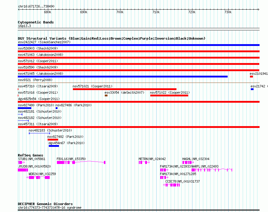 Variant DetailsVariant: nssv675696| Internal ID | 15065662 | | Landmark | | | Location Information | | | Cytoband | 16p13.3 | | Allele length | | Assembly | Allele length | | hg38 | 66765 | | hg19 | 66765 | | hg18 | 66765 | | hg17 | 66765 |
