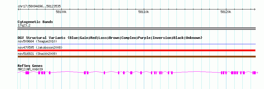 Variant DetailsVariant: nssv676233| Internal ID | 15412885 | | Landmark | | | Location Information | | | Cytoband | 17q23.2 | | Allele length | | Assembly | Allele length | | hg38 | 28840 | | hg19 | 28840 | | hg18 | 28840 | | hg17 | 28840 |