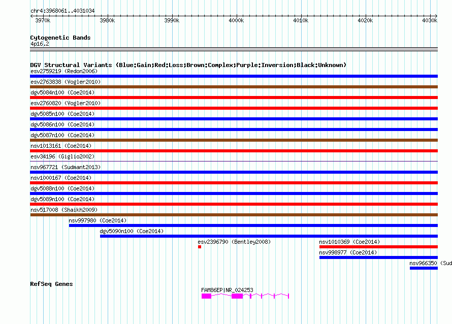 Variant DetailsVariant: nssv677344| Internal ID | 15413996 | | Landmark | | | Location Information | | | Cytoband | 4p16.2 | | Allele length | | Assembly | Allele length | | hg38 | 62999 | | hg19 | 62999 | | hg18 | 62974 | | hg17 | 62974 |