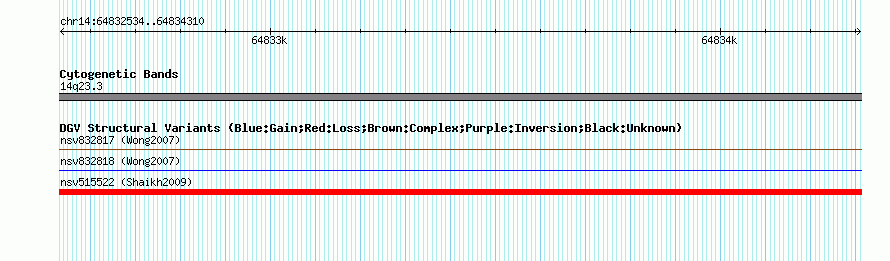 Variant DetailsVariant: nssv678644| Internal ID | 15415296 | | Landmark | | | Location Information | | | Cytoband | 14q23.3 | | Allele length | | Assembly | Allele length | | hg38 | 1777 | | hg19 | 1777 | | hg18 | 1777 | | hg17 | 1777 |