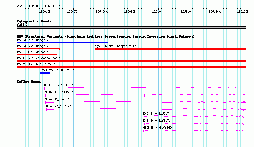 | Variant Type | CNV loss | Copy Number | | Allele State | Heterozygous | Allele Origin | | Probe Count | | Validation Flag | | Merged Status | S | Merged Variants | nsv519767 | Supporting Variants | | Samples | | Known Genes | NEK6 | Method | SNP array | Analysis | Sample-level CNVs | Platform | GPL6434 | Comments | | Reference | Shaikh_et_al_2009 | Pubmed ID | 19592680 | Accession Number(s) | nssv679769