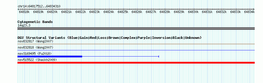 Variant DetailsVariant: nssv680286| Internal ID | 15416938 | | Landmark | | | Location Information | | | Cytoband | 14q23.3 | | Allele length | | Assembly | Allele length | | hg38 | 16799 | | hg19 | 16799 | | hg18 | 16799 | | hg17 | 16799 |