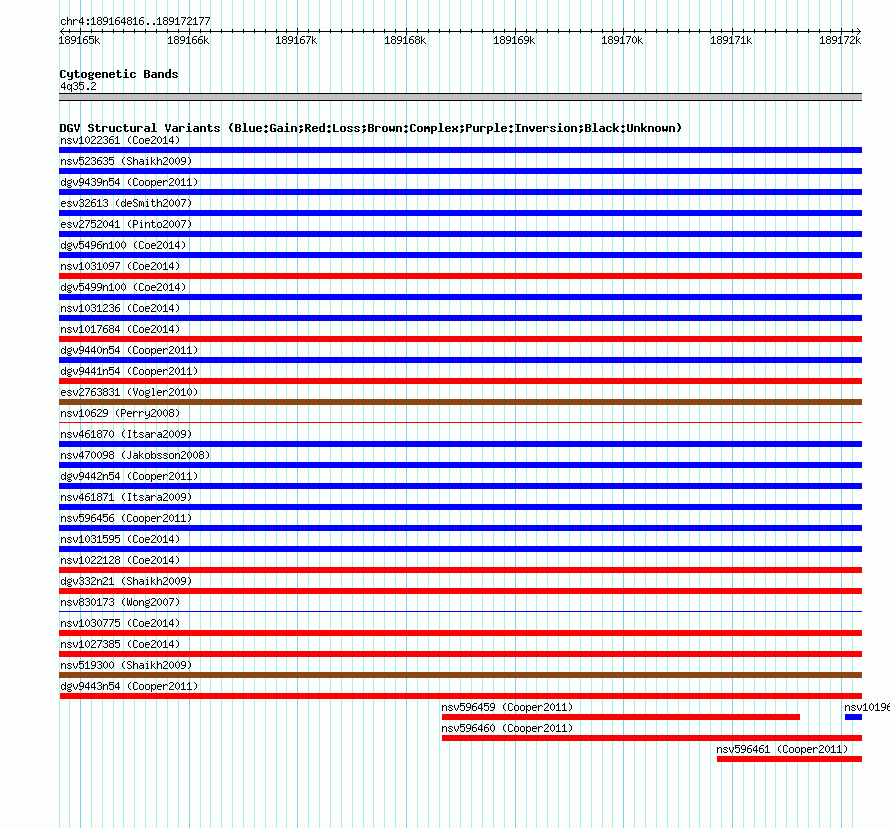 Variant DetailsVariant: nssv680541Internal ID | 15070507 | Landmark | | Location Information | | Cytoband | 4q35.2 | Allele length | Assembly | Allele length | hg38 | 7362 | hg19 | 7362 | hg18 | 7362 | hg17 | 7362 |
