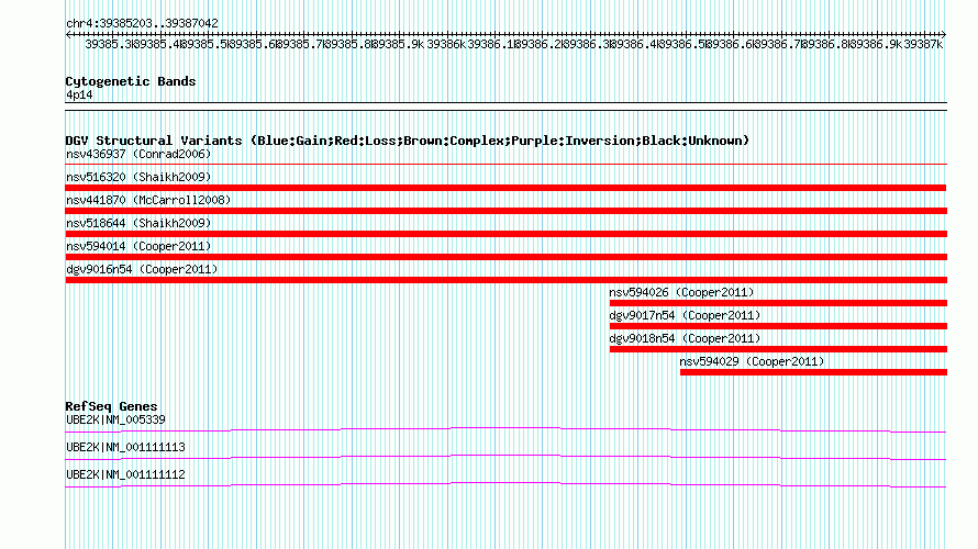 | | Variant Type | CNV loss | | Copy Number | | | Allele State | Heterozygous | | Allele Origin | | | Probe Count | | | Validation Flag | | | Merged Status | S | | Merged Variants | nsv516320 | | Supporting Variants | | | Samples | | | Known Genes | UBE2K | | Method | SNP array | | Analysis | Sample-level CNVs | | Platform | GPL6434 | | Comments | | | Reference | Shaikh_et_al_2009 | | Pubmed ID | 19592680 | | Accession Number(s) | nssv680677