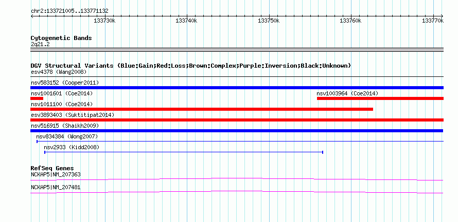 | Variant Type | CNV gain | Copy Number | | Allele State | | Allele Origin | | Probe Count | | Validation Flag | | Merged Status | S | Merged Variants | nsv516915 | Supporting Variants | | Samples | | Known Genes | MIR7853, NCKAP5 | Method | SNP array | Analysis | Sample-level CNVs | Platform | GPL6434 | Comments | | Reference | Shaikh_et_al_2009 | Pubmed ID | 19592680 | Accession Number(s) | nssv680710