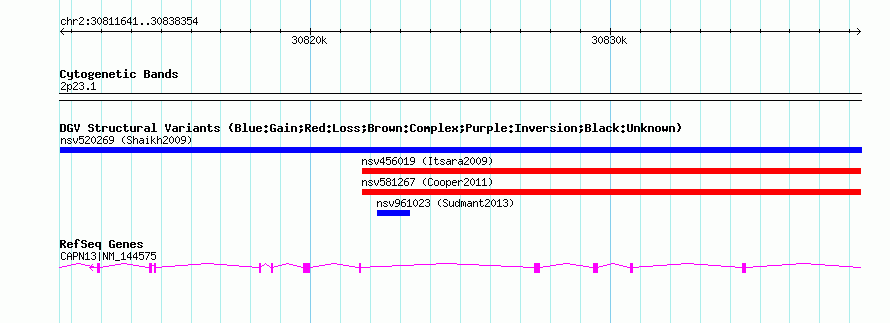 | Variant Type | CNV gain | Copy Number | | Allele State | | Allele Origin | | Probe Count | | Validation Flag | | Merged Status | S | Merged Variants | nsv520269 | Supporting Variants | | Samples | | Known Genes | CAPN13 | Method | SNP array | Analysis | Sample-level CNVs | Platform | GPL6434 | Comments | | Reference | Shaikh_et_al_2009 | Pubmed ID | 19592680 | Accession Number(s) | nssv681873