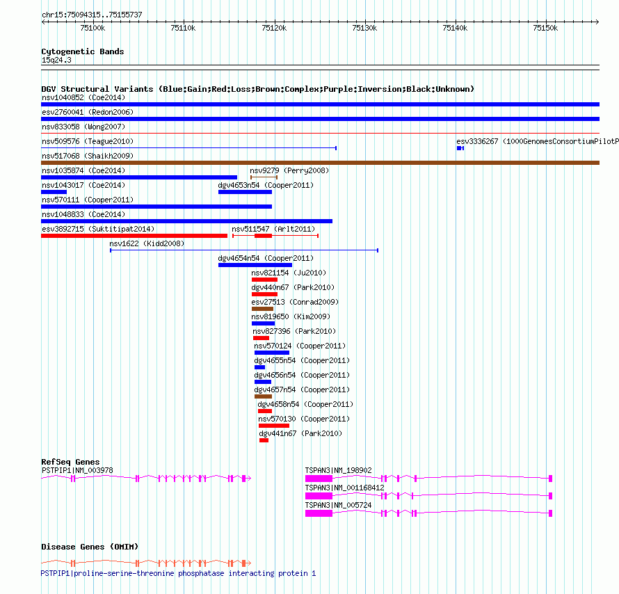 Variant DetailsVariant: nssv682226| Internal ID | 15418878 | | Landmark | | | Location Information | | | Cytoband | 15q24.3 | | Allele length | | Assembly | Allele length | | hg38 | 61422 | | hg19 | 61423 | | hg18 | 61423 | | hg17 | 61423 |