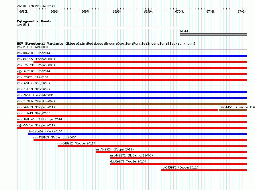 Variant DetailsVariant: nssv682252| Internal ID | 15418904 | | Landmark | | | Location Information | | | Cytoband | 10p14 | | Allele length | | Assembly | Allele length | | hg38 | 7351 | | hg19 | 7351 | | hg18 | 7351 | | hg17 | 7351 |