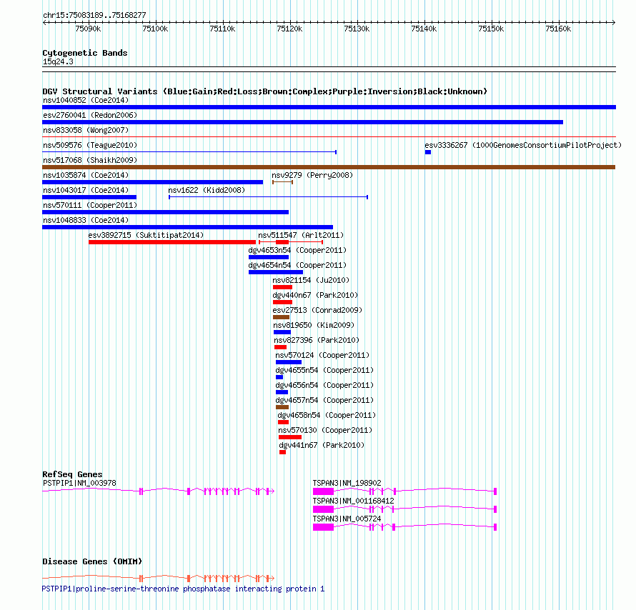 | | Variant Type | CNV loss | | Copy Number | | | Allele State | Heterozygous | | Allele Origin | | | Probe Count | | | Validation Flag | | | Merged Status | S | | Merged Variants | nsv517068 | | Supporting Variants | | | Samples | | | Known Genes | PSTPIP1, TSPAN3 | | Method | SNP array | | Analysis | Sample-level CNVs | | Platform | GPL6434 | | Comments | | | Reference | Shaikh_et_al_2009 | | Pubmed ID | 19592680 | | Accession Number(s) | nssv682321