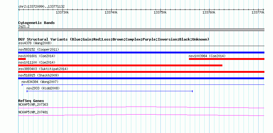 | Variant Type | CNV gain | Copy Number | | Allele State | | Allele Origin | | Probe Count | | Validation Flag | | Merged Status | S | Merged Variants | nsv516915 | Supporting Variants | | Samples | | Known Genes | MIR7853, NCKAP5 | Method | SNP array | Analysis | Sample-level CNVs | Platform | GPL6434 | Comments | | Reference | Shaikh_et_al_2009 | Pubmed ID | 19592680 | Accession Number(s) | nssv682704
