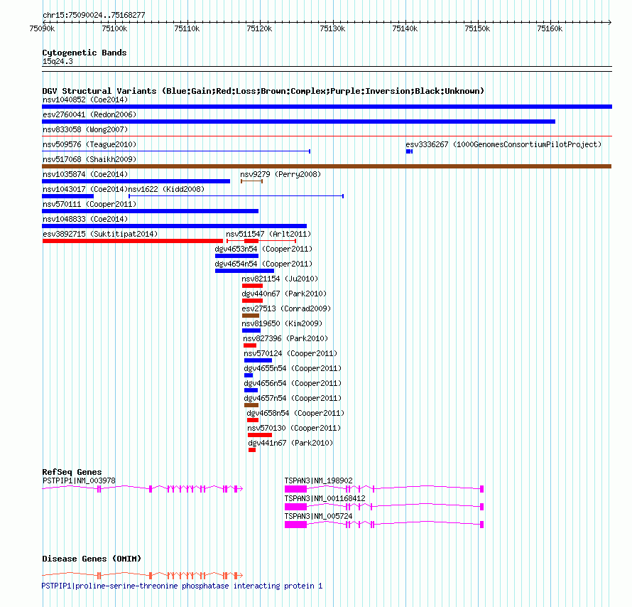 Variant DetailsVariant: nssv683277| Internal ID | 15419929 | | Landmark | | | Location Information | | | Cytoband | 15q24.3 | | Allele length | | Assembly | Allele length | | hg38 | 78253 | | hg19 | 78254 | | hg18 | 78254 | | hg17 | 78254 |