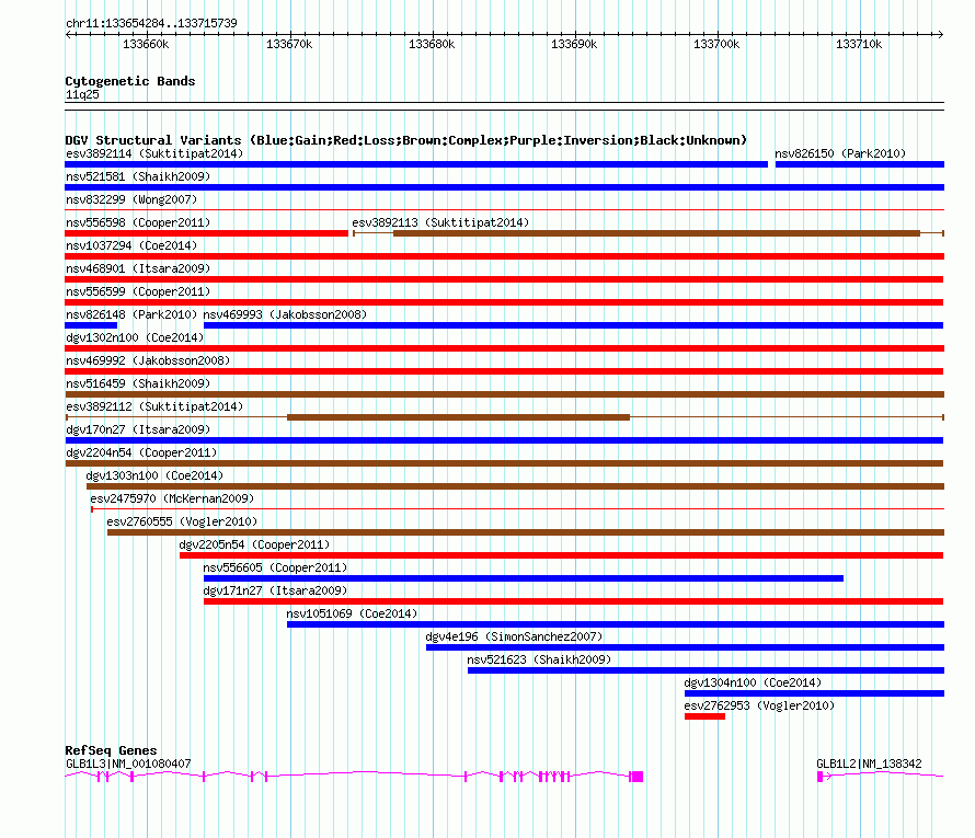| | Variant Type | CNV gain | | Copy Number | | | Allele State | | | Allele Origin | | | Probe Count | | | Validation Flag | | | Merged Status | S | | Merged Variants | nsv516459 | | Supporting Variants | | | Samples | | | Known Genes | GLB1L2, GLB1L3 | | Method | SNP array | | Analysis | Sample-level CNVs | | Platform | GPL6434 | | Comments | | | Reference | Shaikh_et_al_2009 | | Pubmed ID | 19592680 | | Accession Number(s) | nssv683940