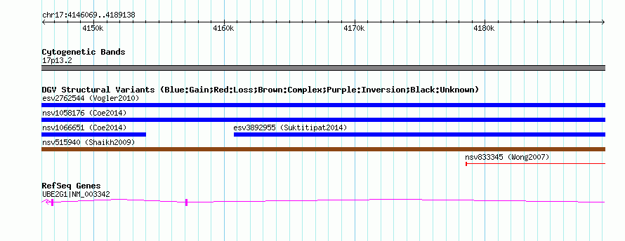 Variant DetailsVariant: nssv684421| Internal ID | 15421073 | | Landmark | | | Location Information | | | Cytoband | 17p13.2 | | Allele length | | Assembly | Allele length | | hg38 | 43070 | | hg19 | 43070 | | hg18 | 43070 | | hg17 | 43070 |