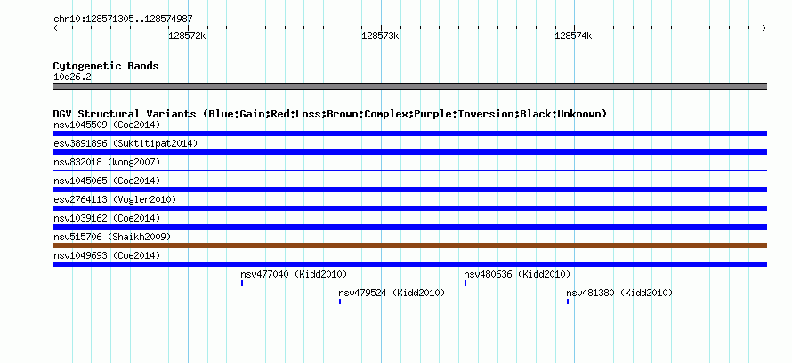 Variant DetailsVariant: nssv684791| Internal ID | 15421443 | | Landmark | | | Location Information | | | Cytoband | 10q26.2 | | Allele length | | Assembly | Allele length | | hg38 | 3683 | | hg19 | 3683 | | hg18 | 3683 | | hg17 | 3683 |