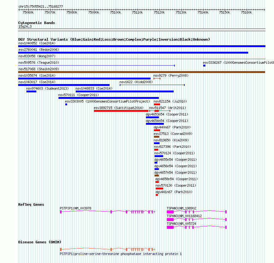 | | Variant Type | CNV loss | | Copy Number | | | Allele State | Heterozygous | | Allele Origin | | | Probe Count | | | Validation Flag | | | Merged Status | S | | Merged Variants | nsv517068 | | Supporting Variants | | | Samples | | | Known Genes | PSTPIP1, TSPAN3 | | Method | SNP array | | Analysis | Sample-level CNVs | | Platform | GPL6434 | | Comments | | | Reference | Shaikh_et_al_2009 | | Pubmed ID | 19592680 | | Accession Number(s) | nssv685115