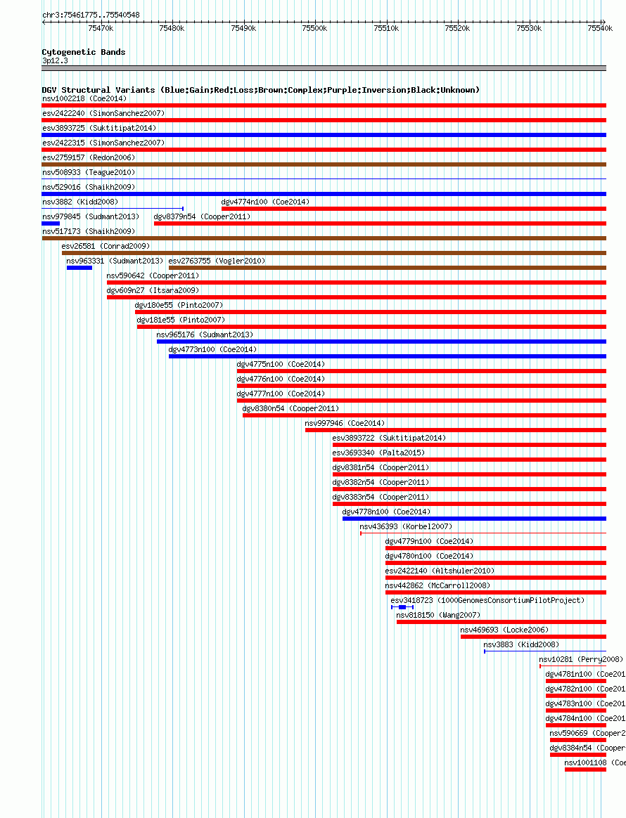 Variant DetailsVariant: nssv685648| Internal ID | 15422300 | | Landmark | | | Location Information | | | Cytoband | 3p12.3 | | Allele length | | Assembly | Allele length | | hg38 | 78774 | | hg19 | 78774 | | hg18 | 78774 | | hg17 | 78774 |
