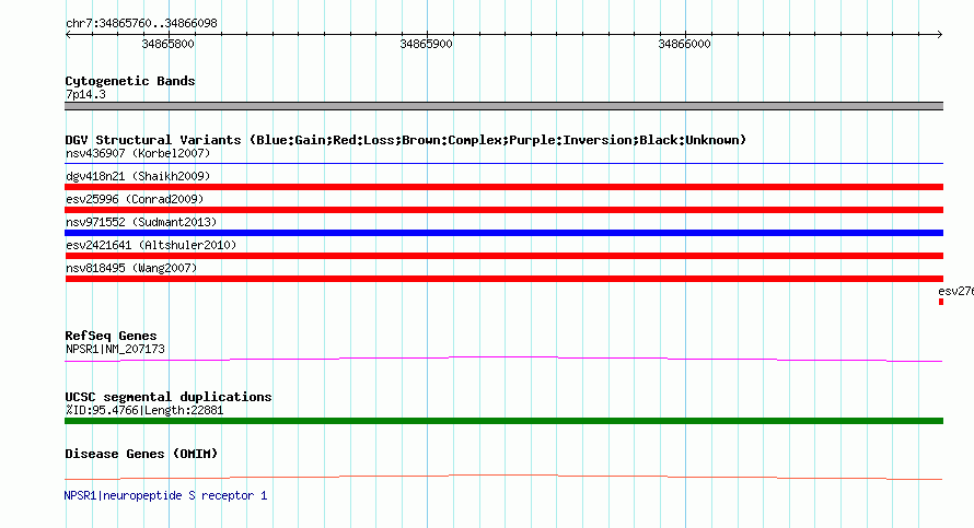 Variant DetailsVariant: nssv687185| Internal ID | 15077151 | | Landmark | | | Location Information | | | Cytoband | 7p14.3 | | Allele length | | Assembly | Allele length | | hg38 | 339 | | hg19 | 339 | | hg18 | 339 | | hg17 | 339 |